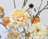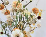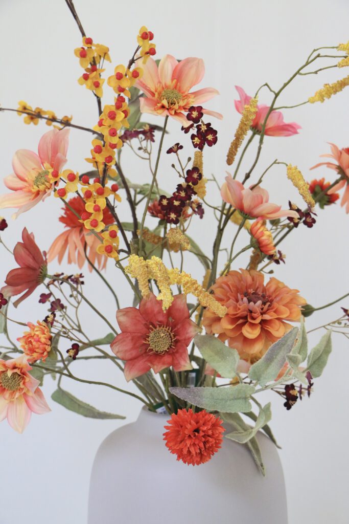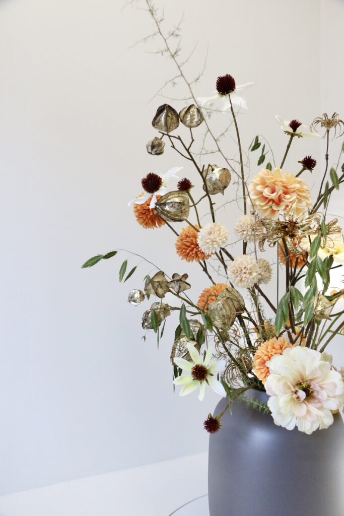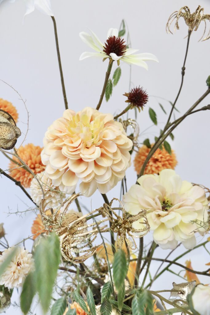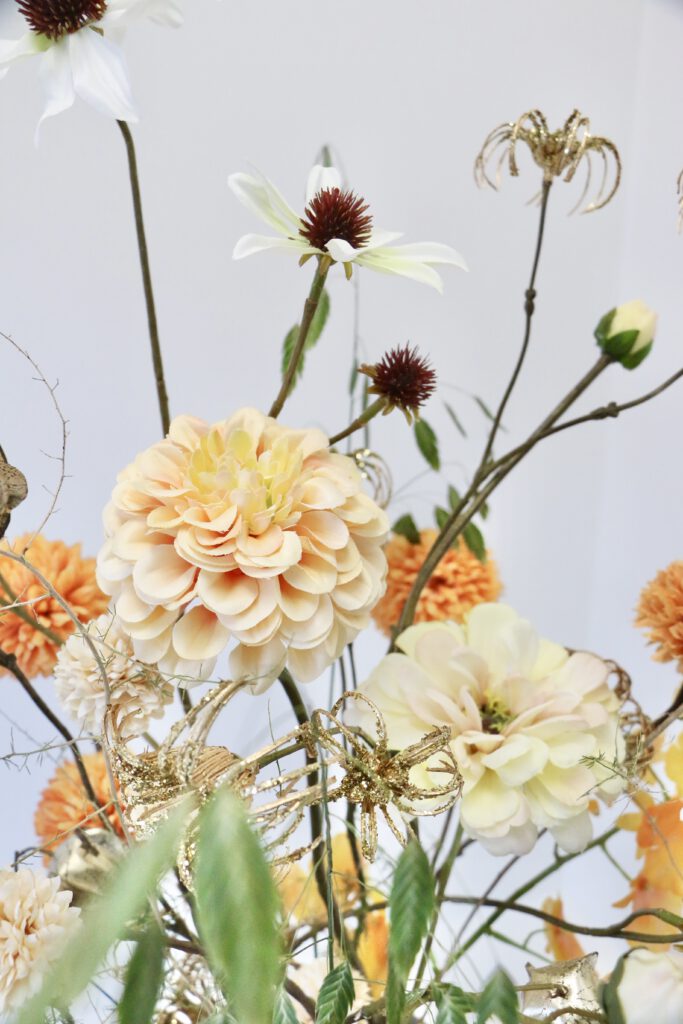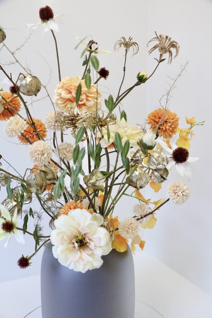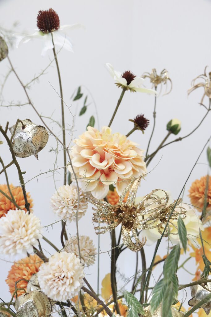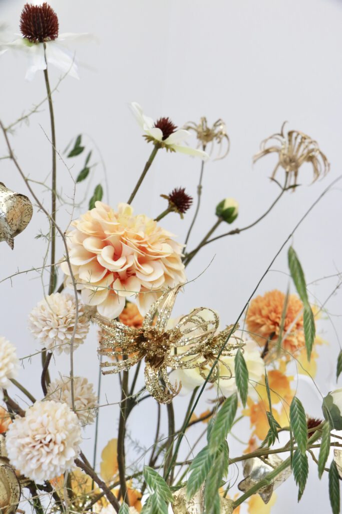Dit zijdeboeket is speels gebonden en heeft feestelijke gouden accenten ✨ Het boeket dat wordt afgebeeld is; formaat middel.