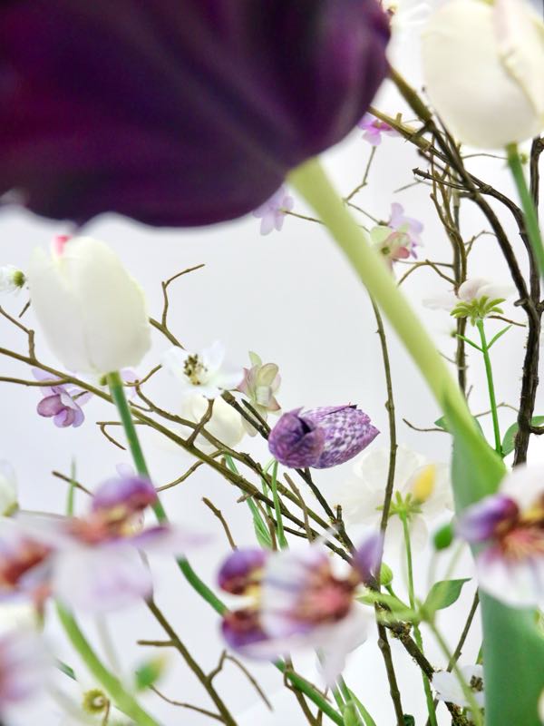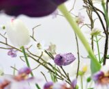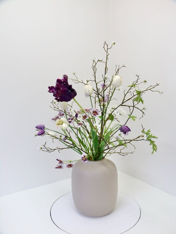 Dit zijdeboeket is speels gebonden in mooie neutrale tinten met paars. Die tulp; wauw! Het boeket dat wordt afgebeeld is; formaat middel.